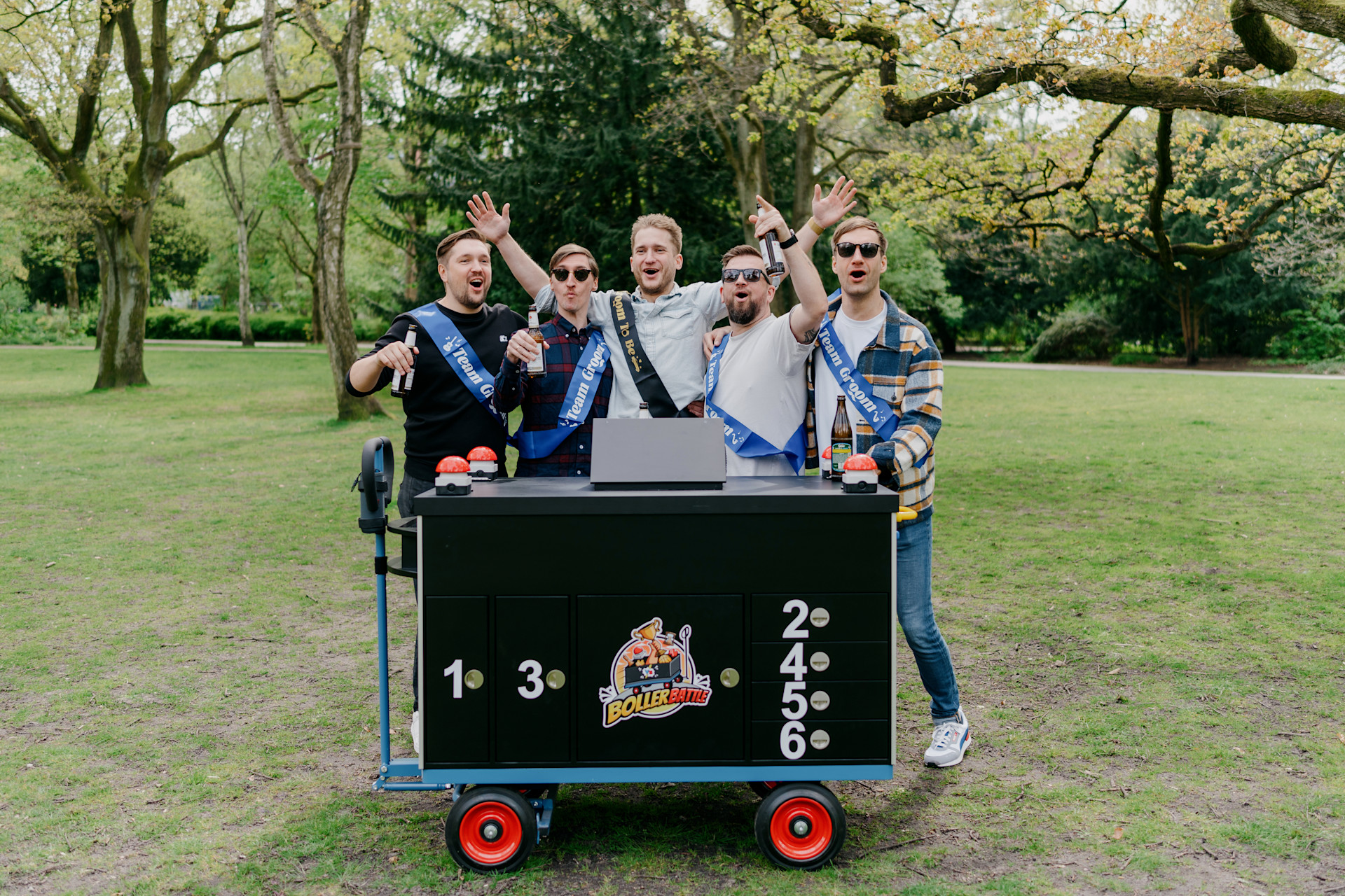 Am Treffpunkt bekommt ihr euren Bollerwagen ausgehändigt. In diesem befinden sich 9 verschiedene Spiele, eine Quiz-Station mit 4 Buzzern, ein großes Fach für eure Getränke, eine ausziehbaren Tisch und eine Bluetooth Box. Jetzt startet eure Bollerwagen-Tour. Der Weg ist bereits festgelegt und startet direkt vor der Tür. Freut euch auf jede Menge Spiel und Spaß, sowie unvergessliche Challenges.